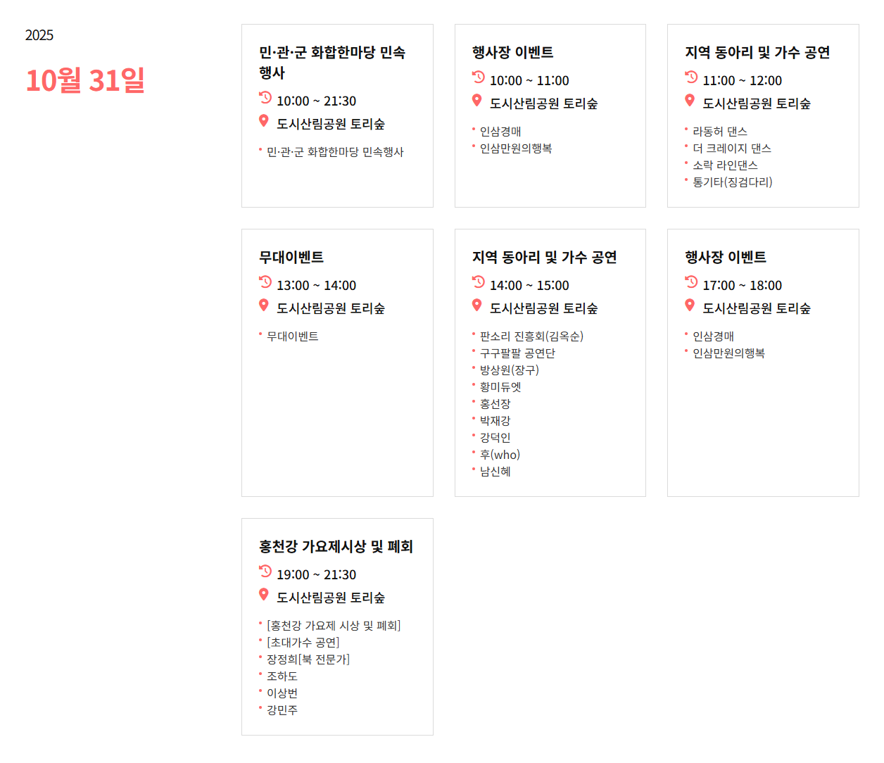 2025년 10월 30일(목)부터 11월 2일(일)까지 4일간, 홍천 도시산림공원 토리숲 일원에서 열린다.