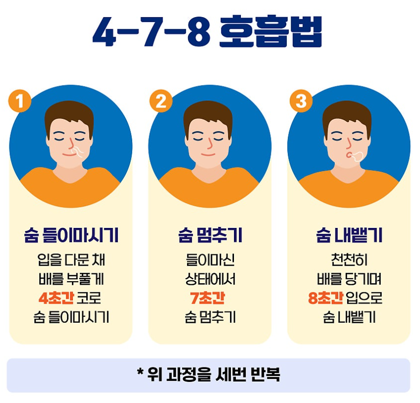 들숨 4초, 숨 멈추기 7초, 날숨 8초.