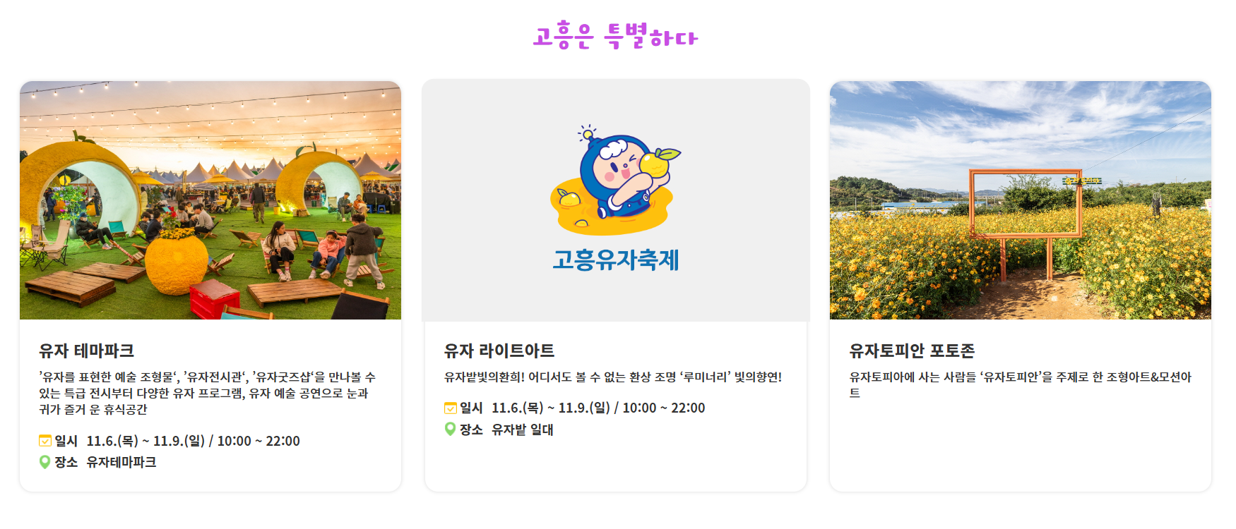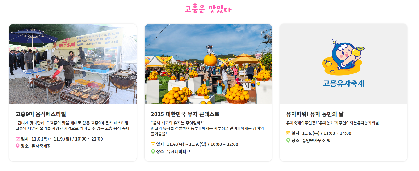 전남 고흥의 대표 가을축제, 2025 고흥 유자축제가 11월 6일부터 9일까지 열린다고 합니다.