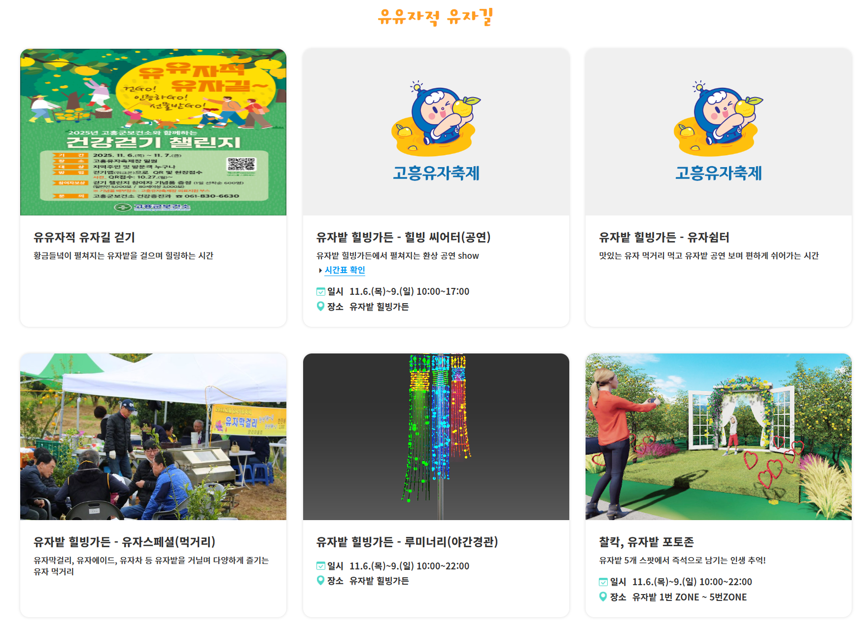 - 유자따기·유자청 체험은 선착순 현장접수, 일부 프로그램은 조기 마감될 수 있다.