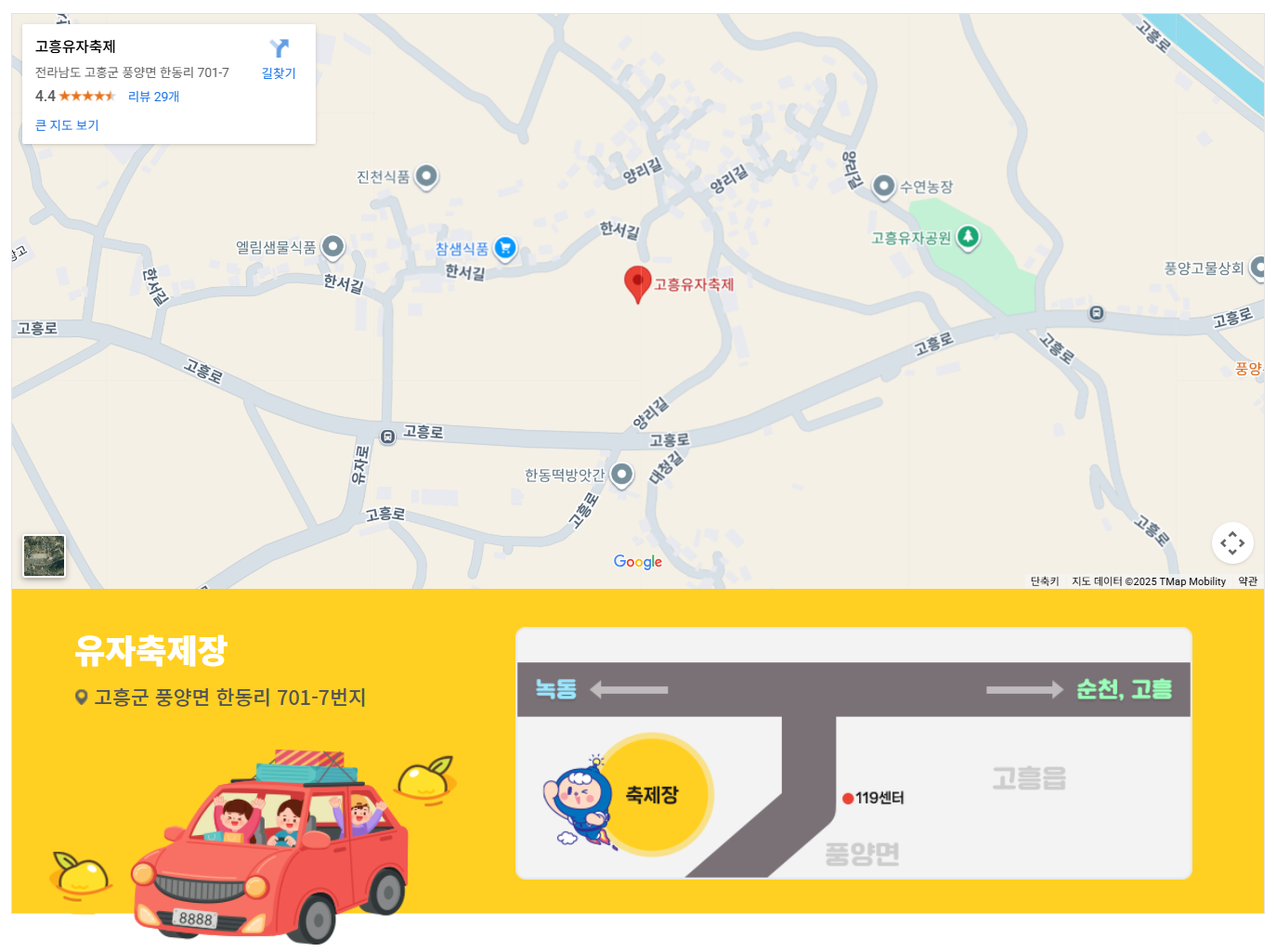 - 자가용: 네비게이션에 ‘고흥 유자축제장(풍양면 한동리 유자밭)’ 검색.