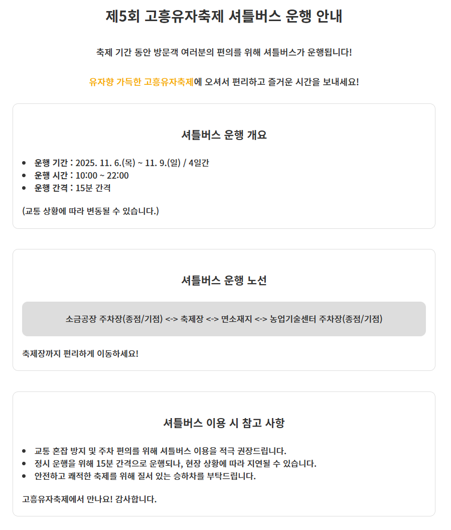 - 대중교통: 고흥공용버스터미널 → 행사장 셔틀 20분 간격 운행(09:00~21:00).